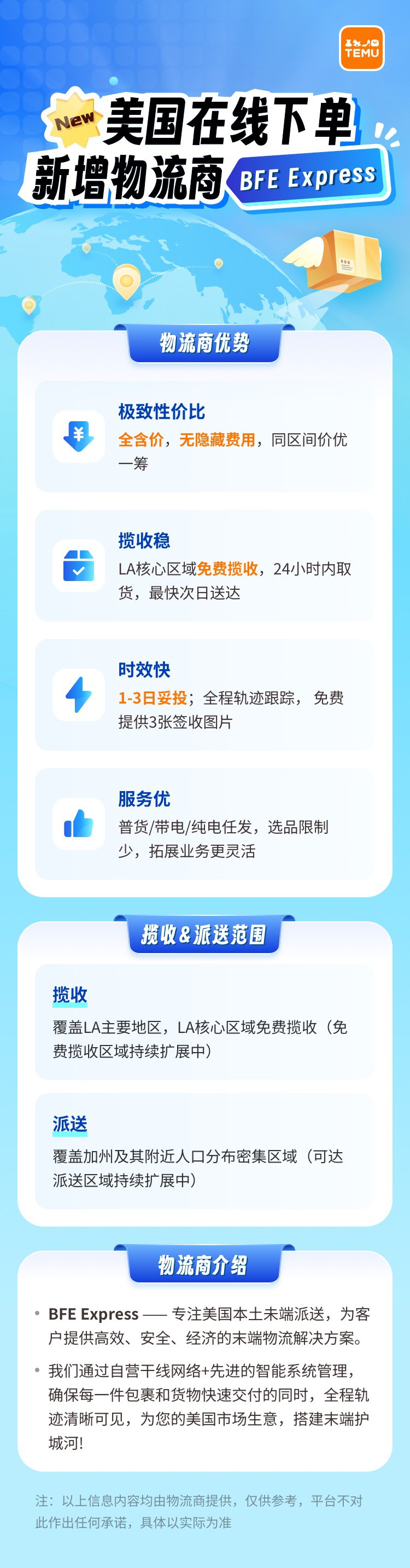 重磅消息!出口易-TEMU賣家物流服務換新升級,自營尾程BFE Express正式上線,成為TEMU新尾程渠道!